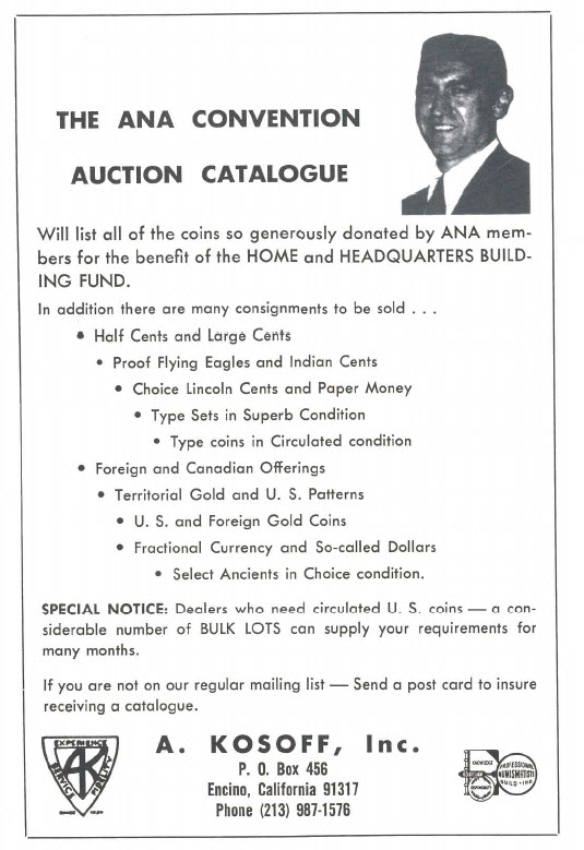 More than any other rare coin dealer of his era, Abe Kosoff helped with projects of the American Numismatic Association. This June 1966 advertisement in "The Numismatist" notes that many donations for the ANA home and Headquarters Building Fund will be featured in a forthcoming auction catalogue. ("The Numismatist," June 1966)