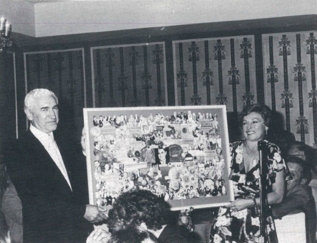Abe Kosoff and daughter Sonnie hold aloft a montage of photographs, cataloguer, and other memorabilia covering Abe's 50th year are a proleoaional numismatists. The year is 1979, and the occasion is a tribute given at the banquet of the Numismatic Association of Southern California.
