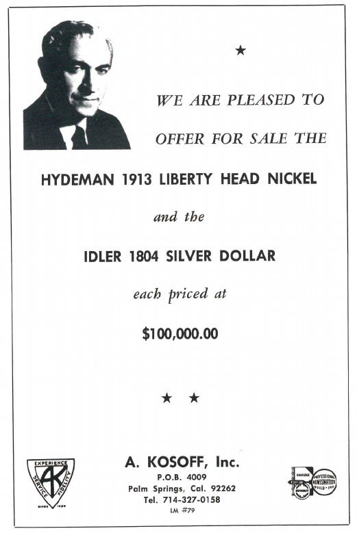 In January 1972, the Hydeman 1913 Liberty Head nickel and the Idler 1804 silver dollar, both of which had appeared in the 1961 catalogue of the Hydeman Collection, were again offered for sale, this time each with a fixed price of $100,000. A sale was consummated later in the year to World-Wide Coin Investments for $100,000 for the nickel and $80,000 for the dollar. ("The Numismatist," January 1972)