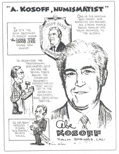 An illustration by Bill King which accompanied a "Numismatic News" feature on Abe Kosoff written by Ed Reiter, This appeared in the March 19, 1974 issue.