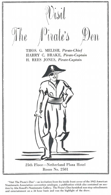 "Due to war activities of members of our firm we cannot be represented at this year's convention of the American Numismatic Association. So we extend our cordial greetings and best wishes for a pleasant, successful meeting. That you should gather during these trying times is a high tribute to the loyalty you have for your Association and a splendid indication of the genuine interest you have in numismatics," noted a special full-page announcement of the New Netherlands Coin Company, New York City, signed by Charles M. Wormser (who was serving in the Navy) and other staff members.