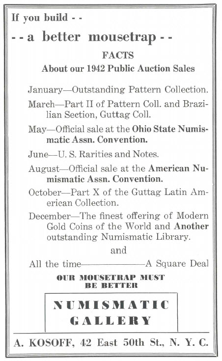 By early 1943, the Numismatic Gallery auction sales were catching on. This February 1943 advertisement in "The Numismatist" discusses auctions of the preceding year. "Our mousetrap must be better," Abe Kosoff concluded.