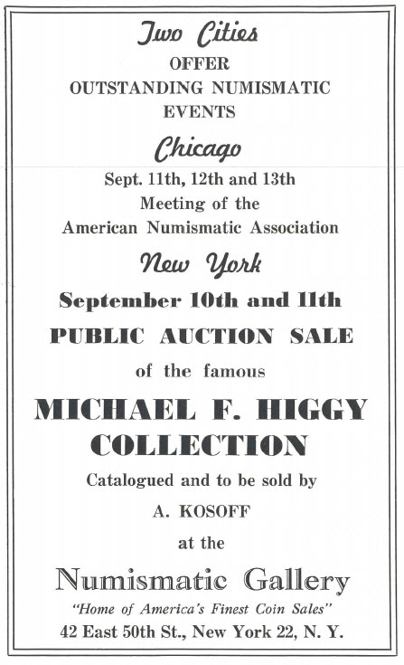 The Michael F. Higgy Collection, auctioned in New York City on September 10th and 11th, 1943, was the best yet for Abe Kosoff. Although the financial rewards were small, the publicity awards were immense. Many items brought multiples of catalogue listings, and the event created a sensation in the hobby. The sale catalogue was the first Kosoff production to have certain lots illustrated. (The Numismatist," September, 1943)