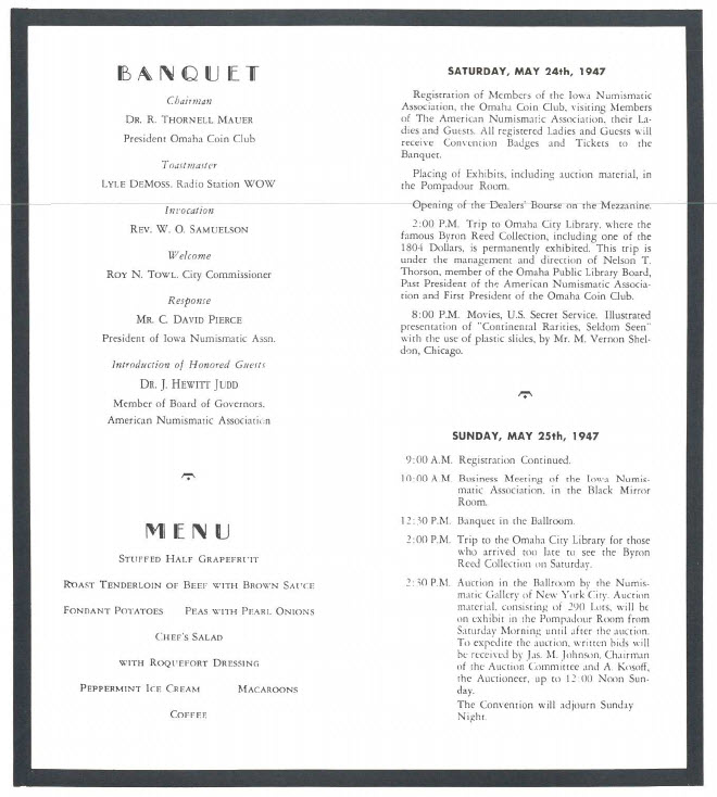 On Sunday, May 25th, 1947 the Numismatic Gallery conducted an auction sale in conjunction with the Iowa Numismatic Association convention held at the Fontenelle Hotel, Omaha Nebraska. It is probable that the modest sale which consisted of only a few hundred lots, was held as a favor to Dr. J. Hewitt Judd, C. David Pierce, and other Iowa numismatists who were close to Abe Kosoff and Abner Kreisberg, and in respect to the ANA convention conducted in low the preceding year.