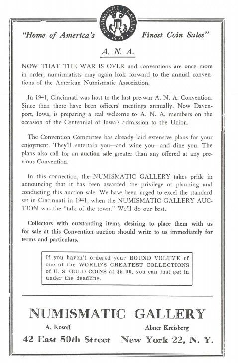 In 1946 the Numismatic Gallery was again tapped to conduct an American Numismatic Association sale, the first catalogued by A1 Kosoff since the Cincinnati event in 1942. Again the sale catalogue was combined with the official convention program, with the somewhat curio result that the Numismatic Gallery auction w interleaved with large advertisements by B. M; Mehl, Wayte Raymond, Whitman Publishing Co. James Kelly, R. Green, David M. Bullowa, Celina Coin Company, H.W. Holzer, Hans M. Schulman, Capitol Coin Co., Stack's, Hollin beck Stamp & Coin Co., Bebee Stamp & Coin Co., Paul B. Volk & Sons, Pittsburgh Coin Exchange, S Kaplan, George J. Bauer, French's, F.K. Saa Frank J. Katen, and other competitors.