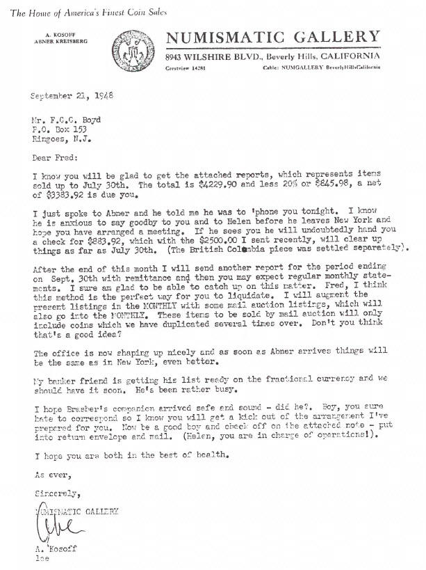 To accommodate late evening weekday shoppers, The Numismatic Gallery remained open Monday evenings until nine. While "friend or wife goes a-shopping, you pay us a visit!" suggested the Numismatic Gallery Monthly in October 1948.