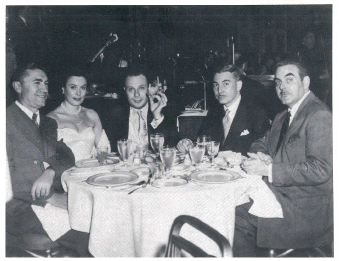 Abe Kosoff (left), Hans Schulman (center), and others gather on May 13, 1952 to celebrate Hans' birthday.