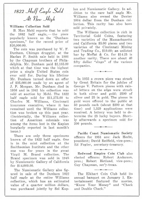 A page from the January 1951 issue of "The Numismatic Scrapbook Magazine" tells of the famous 1822 half eagle and the sale of the Williams Collection.