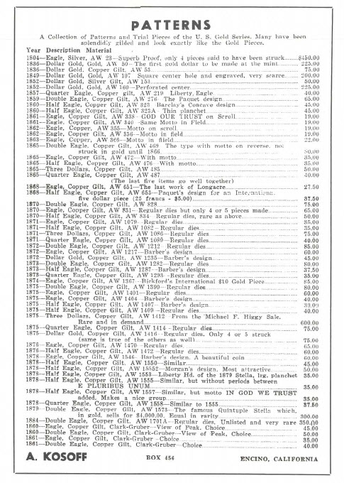 A priced offering of United States pattern coins, probably primarily from the Farouk Collection. ("The Numismatic Scrapbook Magazine," January 1955)