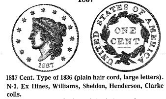 Cent. Head of '36. Plain hair cord, narrow truncation, large letters. N-3; check-mark die defect at left end of dash under CENT. Second earliest variety of the year, coming immediately after the very rare N-17, and preceding the large muling group which includes all the other First Head (Head of '36) coins. (1) Bement: 376, Beckwith: 88, H. c., W. F. Morgan: 282 - Mehl -T. J. Clarke: 278 - N. J. Specialist. (2) Calif. Specialist, ex H. Chapman as 'A-2', Hines, Charles Williams, W. H. Sheldon, Ernest Henderson, T. James Clarke. (3) Bement: 377. (4) Philadelphia Estate ex C. David Pierce, Kagin 8/45. (5) I once owned an impaired proof and have seen one other that appears to be in the same category. Reverse die shows varying strengths of a crack through MERICA, stem, ribbon fold, left ribbon tip and UNITED; business strikes have it heavier.