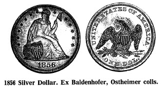 Silver Dollar. *B-2. Slanting 5. Date larger than on any other denomination, even the $20. Style of numerals more like those of 1854 than 1855. Reverse is a die used in later years. Early state: clear lines in field above ITE and between ES; on later impressions these lines become fainter though they do not vanish. Small unpolished curved areas at bottoms of rightmost and next to right white stripes as well as at upper corner of former. Two arrows join, claws almost join, extremely slight unpolished area between upper leaves only; lines join bases of AM and RI. (1) SI ex Mint. (2) ANS ex Brock, Morgan. (3) Eliasberg. (4) Phila. Estate. (5) Essex Institute: 1019, $3200. (6) Heman Ely, Garrett:274, $3,600. (7) Boyd, WGC: 151, probably reappearing as one to follow. (8) Atwater:237, Neil: 52, ditto. (9) T. James Clarke, NN 48:661, Kagin. (10) Holmes:2289. (11) Brand, Lichtenfels II: 1169, Jay:380, Scanlon: 1745. (12) Davis-Graves: 1355. I have seen at least eight others and can well believe that these represent not much over half the survivors.