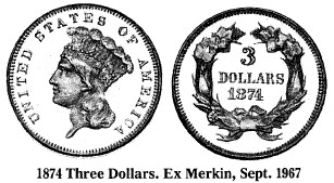 Three Dollars. [20] *B-1. Obv. earlier described, with the die scratch from left upper serif of F leftwards to border still visible, bases of F weaker, light crumbling below middle part of first S in STATES, filling within lower trapezoid of A in STATES, and in A R of AMERICA. Rev. Strong date, upright of 1 and 4 centered below 0 and A. LM 9/67:399. Later state, rusted on obv. device, LM 10/66:323. Ex. rare, in a class with the dollar and quarter eagle. Of maybe a dozen survivors, 3 or 4 are impaired (e.g. Grant Pierce: 1261). Greatly unappreciated even in comparison with 1877-78, probably because date collectors have plenty of business strikes to content them.