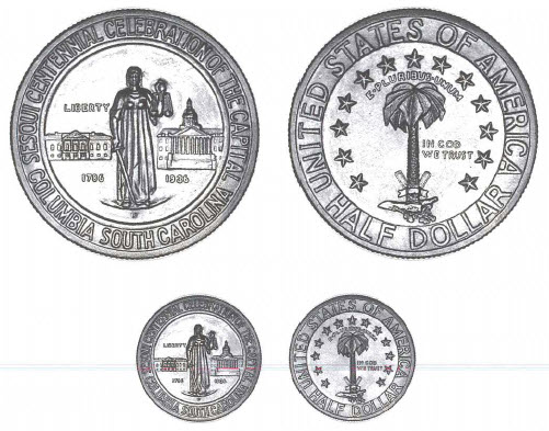 The Columbia Sesqui-Centennial (sic) Commission named A. Wolfe Davidson, a 32-year-old sculptor at Clemson College, to design the work, a choice which was viewed with disdain by the Commission of Fine Arts, which stated that "the models lack artistic merit and are unsatisfactory for translation into a memorial coin," a typical Commission of Fine Arts commentary on a design proposed by an amateur. At the time a promotional brochure noted:
