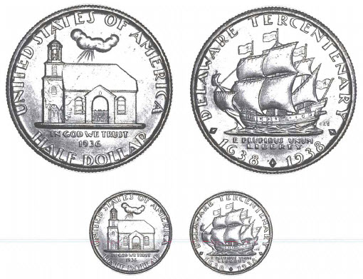 The issuing commission designated the ship side of the Delaware Tercentenary half dollar as the obverse; Mint records designated the church side as the obverse (today collectors agree with the Mint records).