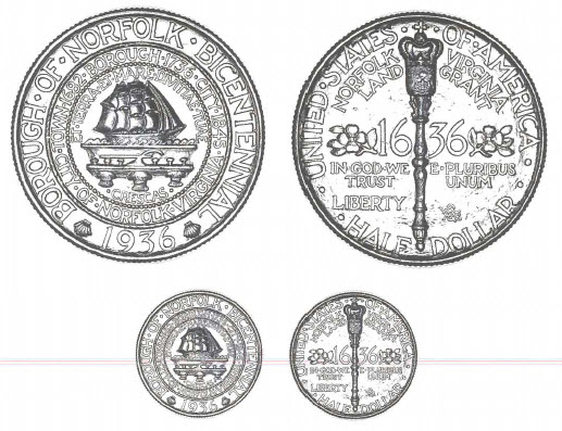 An obscure event in American history was the change of Norfolk, Virginia, a village founded in 1682, to the borough form of government in 1736. In 1936 the city fathers thought that the 200th anniversary of the town's borough status should be brought to national attention by issuing Norfolk Bicentennial commemorative half dollars. The same year, 1936, was also the 300th anniversary of the 1636 land grant on which Norfolk was founded.