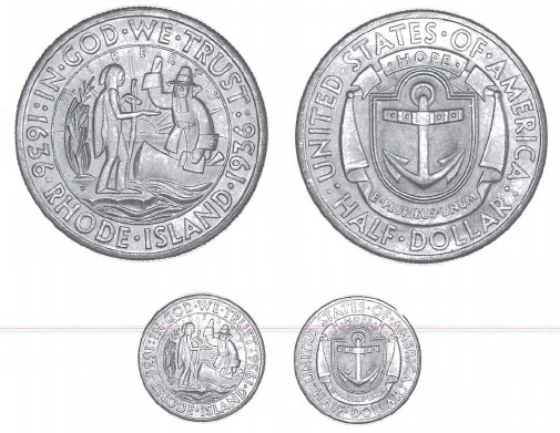 The 300th anniversary of the landing of Roger Williams in Rhode Island on June 24, 1636, and the subsequent establishment of the Providence Plantations furnished the occasion for issuing 1936-dated commemorative half dollars. Curiously, no reference to the city of Providence appeared on the coins. Roger Williams, depicted on the coins, was born in England and came to America in 1631. In Massachusetts he quarreled with religious and colony leaders and had the audacity to suggest that settlers should compensate the native Indians for land taken. Williams was commanded to leave, and an effort was made to send him back to England. He escaped with four companions and in early 1636 settled on the shore of Narragansett Bay and established a settlement named Providence in gratitude for God's help when he was in distress. He negotiated with the Indians and, true to his principles, purchased the land for the new colony. The community grew under a government which permitted freedom of religious expression and the separation of church and state. In 1644 several towns in the area were combined under a charter incorporating the Providence Plantations.