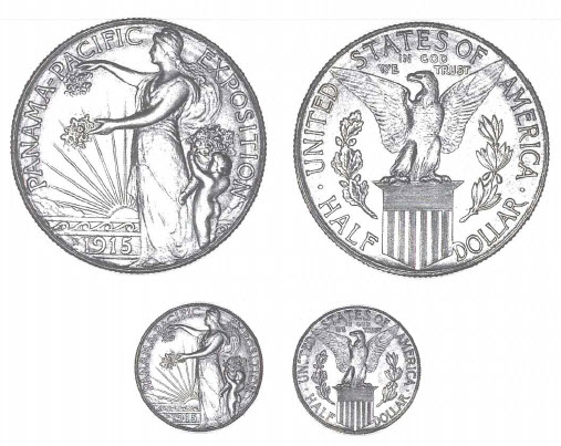 The next silver commemorative coin to be created was the 1915-S half dollar struck in San Francisco in conjunction with the Panama-Pacific International Exposition held in that city in 1915 to celebrate the 1914 completion of the Panama Canal and the rebirth of the Golden Gate City from the 1906 earthquake and fire.