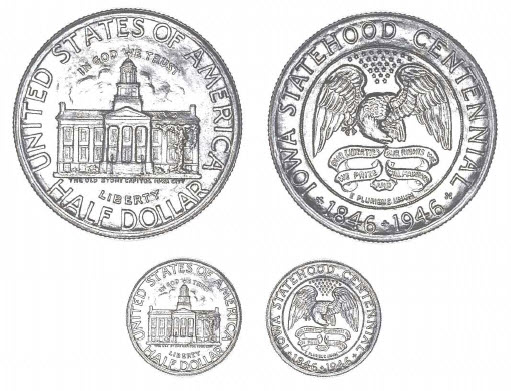 After approval of the design was rubber stamped with little comment by the Com-mission of Fine Arts, the models were prepared at the Philadelphia Mint. In November 100,057 coins were struck and shipped to the Iowa Centennial Committee in Des Moines (Ralph Evans, the chairman of the Sub-Committee on Coins, lived in and corresponded from Davenport). The Iowa Centennial coins were placed on sale in November. By this time the coin market was exceedingly strong, and the pieces found a ready sale at $2.50 each to residents of Iowa and $3 to buyers located elsewhere; 5,000 examples being reserved for out-of-state purchasers. The effort was a great success, and the available pieces were sold out by March 1947, by which time the price had been raised to $ 3 to all comers.