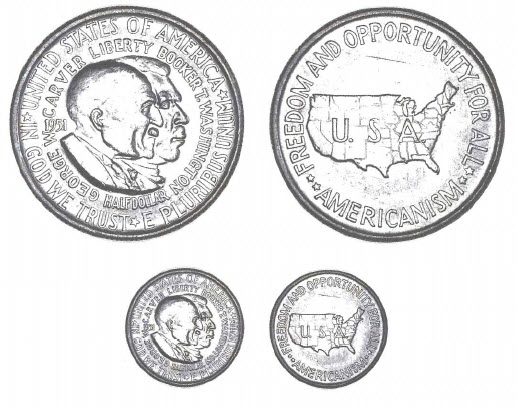 Two subjects were to be honored on the new coin: Dr. George Washington Carver and Booker T. Washington (the life of the latter is described earlier in this text). Born circa 1864 in Diamond, Missouri, the son of a slave, George Carver (his Washington middle name was added later in life) worked diligently, gained a college education, and went on to distinguish himself in the fields of agriculture and botany. At one time he assembled a collection of 20,000 mushroom specimens. Later he joined the Tuskegee Institute and set up an agricultural research facility there, discovering new and profitable uses for soybeans, peanuts, sweet potatoes, and other crops. Peanuts in particular were a specialty, and Dr. Carver astonished his contemporaries by discovering over 300 commercial uses for this hitherto unappreciated crop. Dr. Carver's death occurred on January 5, 1943.