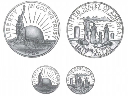 Three different coin denominations were produced in connection with the observation: the Statue of Liberty half dollar (made in copper-nickel clad alloy; the first commemorative in this format), the Statue of Liberty-Ellis Island silver dollar, and the Statue of Liberty $5 gold piece, under provisions of the Act of July 9, 1985, which provided for the coinage of up to 25,000,000 half dollars, 10,000,000 silver dollars, and 500,000 $5 gold coins. The official sale period was from November 1, 1985, through December 31, 1986.