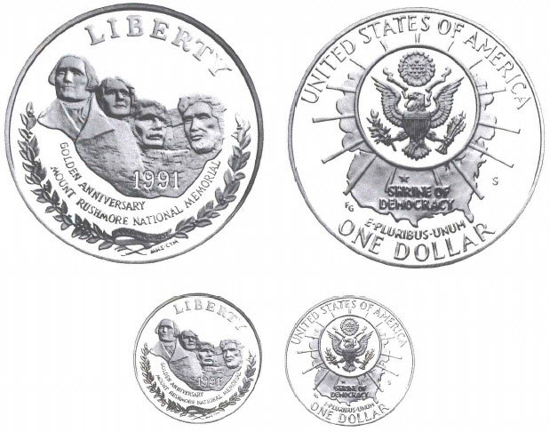 Under the provisions of the Mount Rushmore National Memorial Coin Act (public Law 101-332, July 16, 1990), 1991-dated coins (including 2,500,000 silver dollars) were authorized to be minted to commemorate the 50th anniversary of the sculpture. (For historical and legislative information see earlier listing under the 1991 Mount Rushmore half dollar).