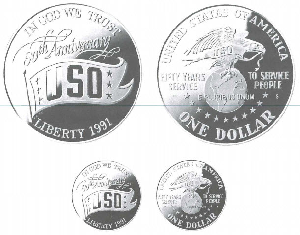 The legislation stated: "The design of the coins shall... be emblematic of the services provided by the USO to military service personnel and families [and shall include the date 1991 and the regular statutory inscriptions]. The design for each coin authorized by this act [actually, only one coin was authorized] shall be selected by the secretary [of the Treasury] after consultation with the president of the USO and the Commission of Fine Arts."