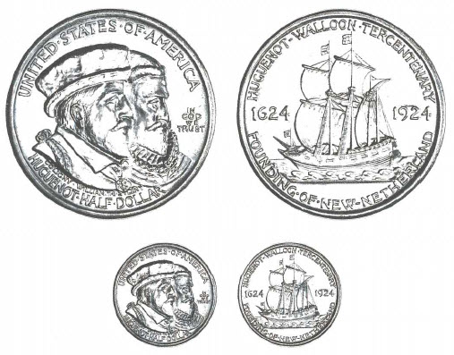 The law provided for 300,000 silver 50-cent pieces to be issued in commemoration of the 300th anniversary "of the settling of New Netherland, the Middle States, in 1624, by Walloons, French and Belgian Huguenots, under the Dutch West India Company." In 1924, from May 17 through 22, Huguenot-Walloon Tercentenary celebrations were held in New York City. Among the activities paid for, at least in part, from the profit derived from the sale of the commemorative coins was the dedication of the National Huguenot Memorial Church at Huguenot Park, Staten Island, on the afternoon of May 18th.