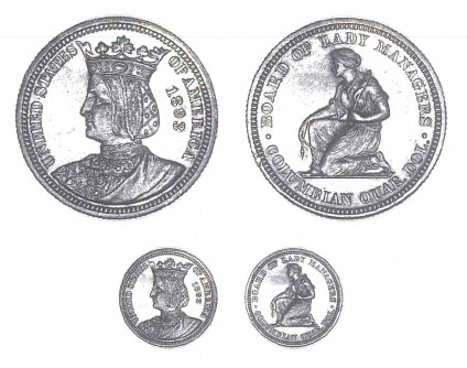 "Mrs. Potter Palmer feels confident that the Isabella silver souvenir coins, granted by Congress to the Board of Lady Managers, will be ready for distribution by May 1st. There are but 40,000 of them, Congress having appropriated $10,000 to be minted in coins at 25¢ each, and already there are indications of efforts to buy them in quantities or 'corner' them.
