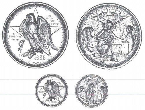 Early in the administration of President Franklin Delano Roosevelt, on June 15, 1933, Congress passed an act to authorize the coinage of silver half dollars" in commemoration of the one hundredth anniversary in 1936 of the independence of Texas, and of the noble and heroic sacrifices of her pioneers, whose revered memory has been an inspiration to her sons and daughters during the past century." This was the first of over two dozen commemorative bills that would become reality during Roosevelt's tenure. The legislation provided that no more than one and a half million pieces be created on behalf of the American Legion Texas Centennial Committee, located in Austin in that state.