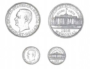 Cornelius Vermeule commented as follows in 1971: (Numismatic Art in America, p. 105.) "When Barber and Morgan collaborated-one doing the obverse and the other doing the reverse of the coin-the results were almost always oppressive. The McKinley Memorial dollars of 1916 and 1917 bear witness to these stylistic judgments, the unclothed bust on the obverse looking tastelessly Roman and the classical, colonnaded Memorial Building placed across a reverse further constricted by too much, too large lettering."