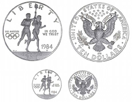New Commemorative Gold Coins In connection with the Los Angeles Olympic Games (see historical and legislative commentary under 1983 Olympic silver dollars), gold coins bearing a legal face value of $10 were issued at four mints using the same alloy and specifications as employed for United States $10 issues circa 1838-1933, the first commemorative gold coins to be struck since the 1926 Sesquicentennial $2.50 gold pieces.