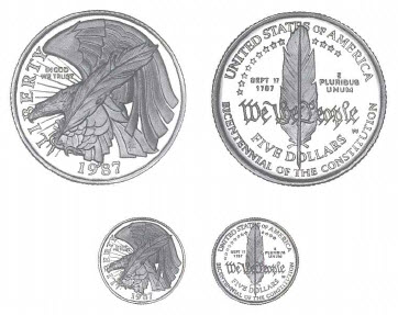 Following a competition involving 11 outside and six Mint artists and sculptors, each of whom received $1,000 for participating, an announcement was made on March 31, 1987, that the designs of private artist Marcel Jovine had been chosen by Secretary of the Treasury James A. Baker III for the 1987 $5 coin.