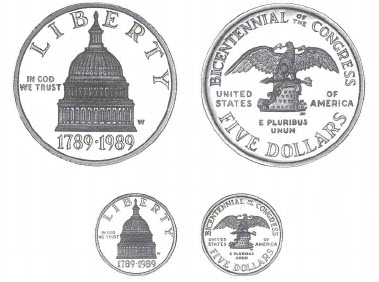 A $5 to Commemorate Congress The 200th anniversary of the operation of Congress under the U.S. Constitution furnished the opportunity in 1989 for the issuance of commemorative coins including a clad half dollar, silver dollar, and $5 gold half eagle, under Public Law 100-673 signed by President Ronald Reagan on November 17, 1988. The legislation provided that the new coins were to be dated 1989 and were allowed to be minted through June 30, 1990. The $5 gold coins "may be issued in Uncirculated and Proof qualities and shall be struck at the United States Mint at West Point, New York," according to the wording of the act.