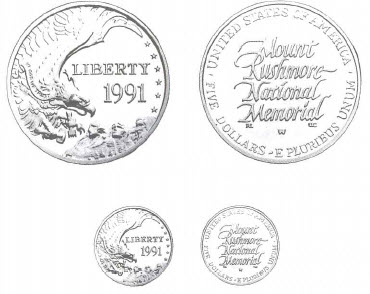Under the provisions of the Mount Rushmore National Memorial Coin Act (public Law 101-332, July 16, 1990), a quantity of 1991-dated $ 5 gold coins not to exceed 500,000 pieces was to be struck to commemorate the 50th anniversary of the monumental sculpture in stone. (For historical and legislative information see the earlier entry under the 1991 Mount Rushmore half dollar.)