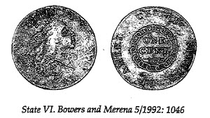Die states: I. Perfect. Obverse is always weak, especially at the date; this may mean that the dies were set minutely too far apart (as though to strike thicker blanks) and in vertical (axial) misalignment so that their faces were not quite in parallel planes. All seen to date have a shallow wedge-shaped bulge extending through the 1 of the date upward to the left into the curls. This does not advance noticeably.