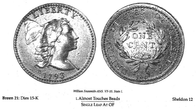 AU-50 Joseph J. Mickley • W. Elliot Woodward. W. Elliot Woodward, 10th Semi-Annual Sale, 10/1867: 1933 $55 • L. Bayard Smith • Virgil M. Brand, 2/7/1941 • B. G. Johnson (St. Louis Stamp & Coin Co.) • Henry C. Hines • Carl Wurtzbach, 1945 • Dr. William H. Sheldon. Sheraton Coin Co. • Ernest Henderson, 1958 • Dorothy Paschal, 1959 • Dr.William H. Sheldon, 4/19/1972 • R. E. Naftzger, Jr., 2/23/1992 • Eric Streiner • Jay Parrino (The Mint). State 1. Obverse illustrated on the Crosby-Levick Plate, in Early American Cents, and in Penny Whimsy. Obverse and reverse illustrated in The United States Coinage of 1793 by Sylvester S. Crosby (1897), and in Noyes.