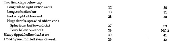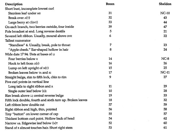 Some collectors marked the edges of their 1794 cents for identification. William Wallace Hays (possibly with collaborators) put Maris attribution numbers on many of his; he initialed 28 of them with H, 8 with CH, 3 with PH, 2 with PHELPS, and 2 with HALL. The reasons for the differences remain obscure. (John W. Adams, "A Numismatic Whodunit," Penny-Wise, no. 59, 3/15/1977, pp. 58-60.) During the last few weeks before his death in 1951, Homer K. Downing, Sheldon's collaborator on Early American Cents, filled the H and D in HUNDRED in yellow on most of his own: these coins appeared in the 1952 ANA Convention sale.