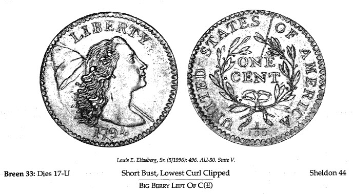 MS-60 Virgil M. Brand • Carl Wurtzbach, 1938 • Dr. William H. Sheldon, 4/19/1972 • R. E. Naftzger, Jr., 2/ 23/1992 • Eric Streiner • Anthony Terranova. State II. Reverse illustrated in Early American Cents and in Penny Whimsy. Obverse and reverse illustrated in Noyes.