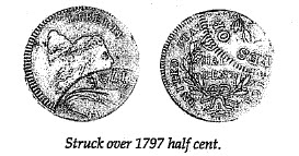Remarks: Discovered by John P. Kennedy, 1928. (First mentioned in The Numismatist 6/1928, p. 351; first ill., Numismatist 8/1928, p. 462.) The second example was discovered in October 1994 by Mark Borckardt. This specimen was struck 65% off-center, then cut down and struck with dies for a 1797 half cent, Breen- 3a, including a lettered edge. (This second example initially generated considerable controversy over the sequence between the large cent and half cent strikes. Mark Borckardt incorrectly argued that the half cent was struck first. However, Chris Pilliod, a metallurgist by trade, offered a definitive explanation of why the large cent strike had to have come first. See Penny-Wise, no. 168, 5/15/1995, pp. 151-155. Recently, in early 1999, the Gallery Mint Museum made reproductions of this overstrike, clearly defining the original circumstances surrounding this emission.)