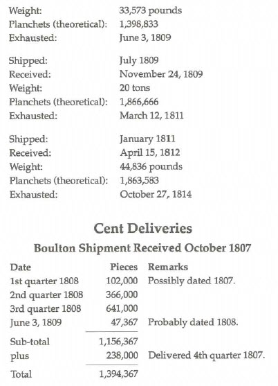 Planchets for the Reich cents were all from various Boulton shipments, however, some data remain incomplete. To make the following discussion intelligible, I append tables of planchet imports and coins struck, 1808-14. (The figures in the following tables are from R. W. Julian, "Mint Imports Copper Planchets in 1801/' Coin World, 3/27/1991, p. 32; "The Large Cents of 1809-11," Numismatist, November 1994; and ''The Cent Coinage of 1812-14," Numismatist, December 1994.)