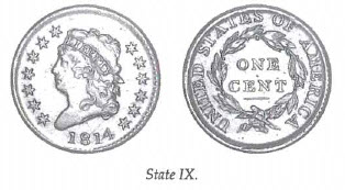 Die stales: I. Perfect dies. No clash marks. No crack from rim to truncation. Without raised ridge at STATES OF. This distinguishes it from any later state with dies lapped to remove clash marks.
