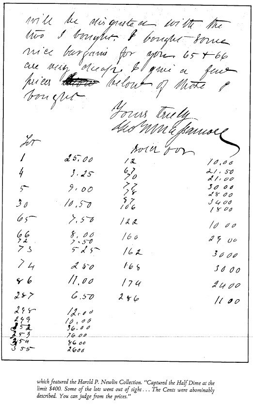 I was successful on most of the lots [Haseltine's 66th sale, featuring the Newlin Collection]. I captured the 1802 half dime at the limit of $400. Some of the lots went out of sight. I got all of the Confederate notes. The 1853 no arrows quarters sold for $22.50. My eyes failed to see any mint lustre. I will try my hand on the one in the Aulick sale. Scott did not attend the sale. Think his gold buyer must have gotten his eyes opened. I sold my 1802 directly after the sale to a gentleman from Lowell, Mass. Was right lucky. The cents were abominably described. You can judge from the prices. I am afraid you will be disgusted with the two I bought. I bought some nice bargains for you. Lots 65 and 66 were very cheap. I give a few prices below of what I bought ....