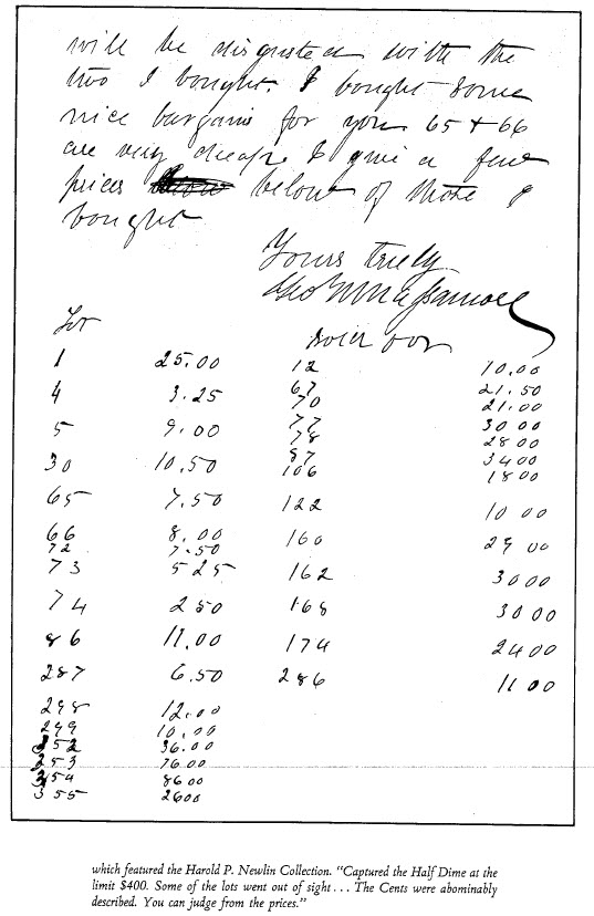 Your favor received. In reply I would say that my list is at my house. You will find however that the price is marked on each envelope. I regret that I cannot further reduce them but I have already put them as low as I can consistently. My sale was a disappointment to me. My finest pieces would have brought double what they did had it not been that a certain collector who pays extravagant prices for fine coins was away from home and did not send one bid. What you do not take I. shall send to him at private sale.