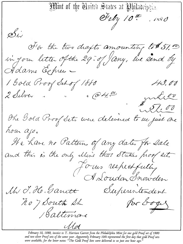 In return for the drafts for $43 gold and $8 currency enclosed in your letter of the second, we send by Adams Express, one gold Proof set of 1879 $43; two silver Proof sets of 1879 $4 each, total $51.