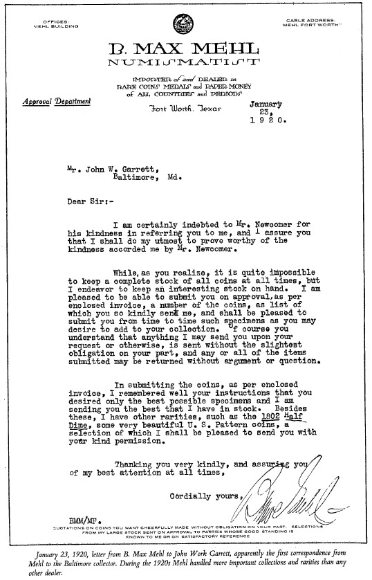 Born in 1884, B. Max Mehl was from Lithuania. He settled in Ft. Worth, Texas, and intended to follow a career in the shoe business. In 1903 he became acquainted with numismatics, and in the following year he ran his first advertisement in The Numismatist, the official journal of the American Numismatic Association. Mehl's Numismatic Monthly, an informative magazine containing numismatic news, articles, and listings of items for sale, made its appearance in 1908 and continued until 1919.