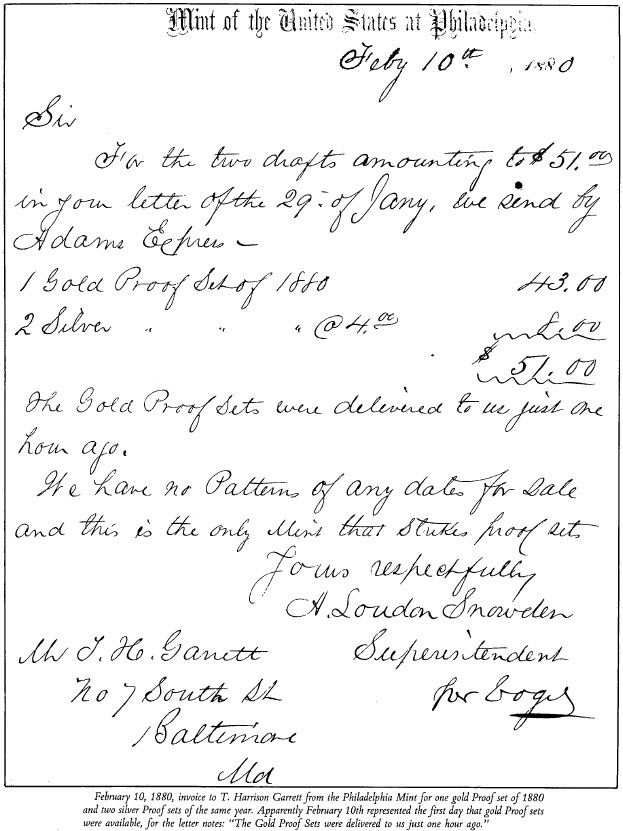I have just purchased and can offer you gold Proof sets from 1890 to 1896. I really have the line from 1890 to 1907 inclusive. I believe your collection lacks the sets from 1890 to 1896 inclusive, and as you have so splendid a line, beginning with 1860, I feel that it might be desirable for you to secure those which you lack. As far as I can see, you lack seven sets.