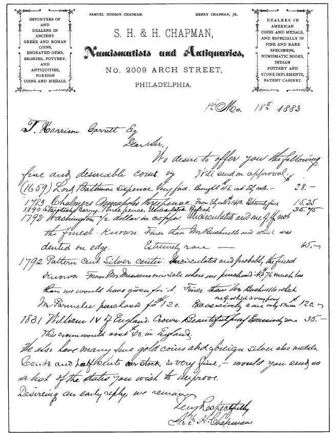 This January 18, 1883 letter, from S. H. & H. Chapman offers T. Harrison Garrett several important rarities. Quotations and offerings from the Chapman Brothers, which were very frequent during this period, usually were quite detailed and often gave comparative price and rarity information.