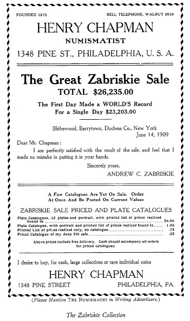 The collection of Capt. Andrew Zabriskie of New York City was sold at auction by Henry Chapman in June 1909. Zabriskie, who had been president of the American Numismatic Society, was one of the oldest collectors in the United States. Included in his holdings were many important pieces. Of these, Chapman noted: