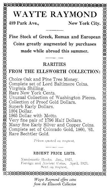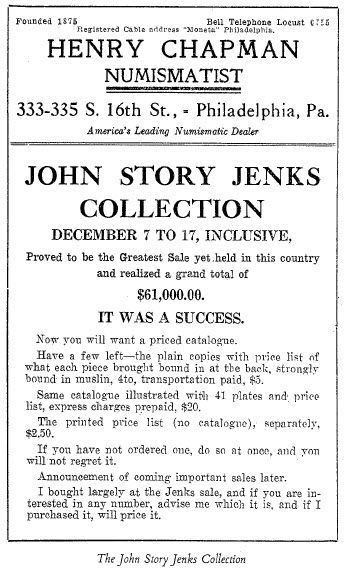 ... that he was probably the oldest collector in the United States, and nearly every important sale has contributed to his collection ... My brother and I have been favored with his exclusive business in our line since 1875. He was always alert to improve the condition of his coins, when a finer example was obtainable, the other was discarded, hence the high grade of nearly every coin in the collection.