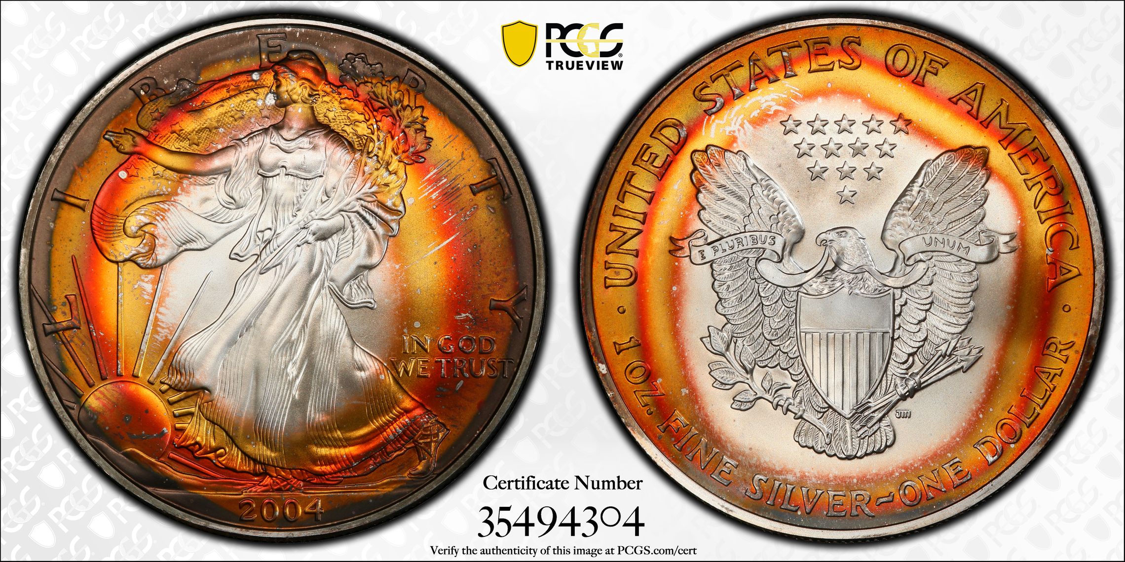 Verification of certification numbers on the PCGS Certification Database does not eliminate the risk of buying counterfeit and altered coins. Though uncommon, counterfeiters may also counterfeit PCGS grading inserts using actual certification numbers derived from public sources.